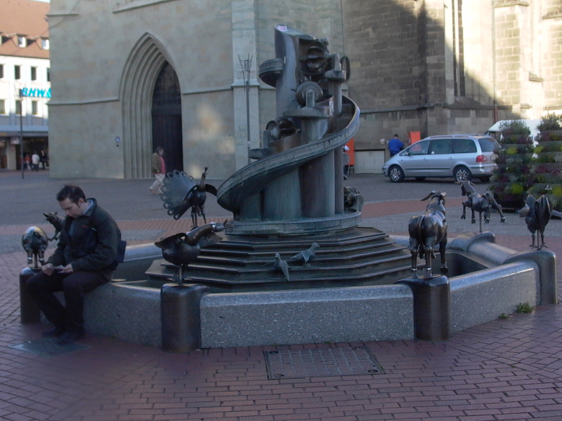 Der Tierbrunnen steht auf dem Markt zwischen der Pauluskirche und dem Standort des alten Rathauses (heute angedeutet durch die Arkaden der Sparkasse).