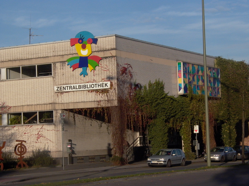 Die frühere Hammer Zentralbibliothek am Osttor. Der farbenfrohe Flattermann ist ein Werk von Otmar Alt.